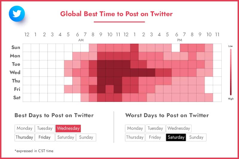 A lot of people scroll through Twitter throughout the day, but many start the morning catching up on Tweets they missed the night before. That said, the best time to post on Twitter is at 8 A.M. However, posting between 6 A.M. to 9 A.M. will help you increase engagement.