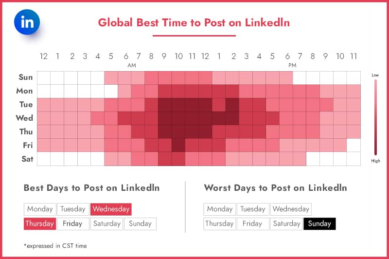 When it comes to LinkedIn, it’s pretty easy to follow. The best days to post are on Tuesday and Wednesday.
