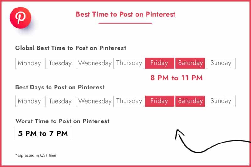 A majority of Pinterest’s audience are women and they’re most active late at night. Yet, the best days to post aren’t during the week. Pinterest users are most active during the weekends. The best days to post are on Friday and Saturday.
