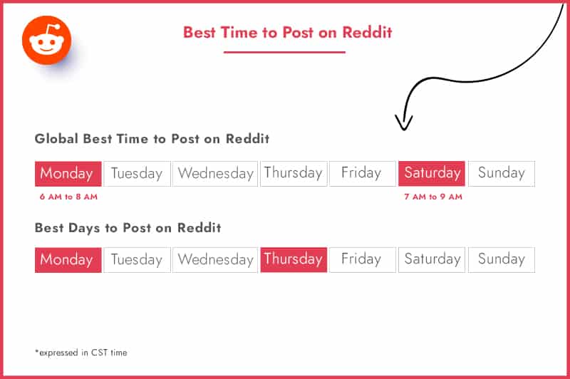 The best time to post on Reddit on the weekdays is from 6 A.M. to 9 A.M. On weekends, the best time to post is between 7 A.M. and 9 A.M.
