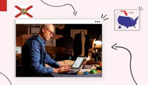 hand signing form man with laptop and docs calculation business license costs states map Indiana map