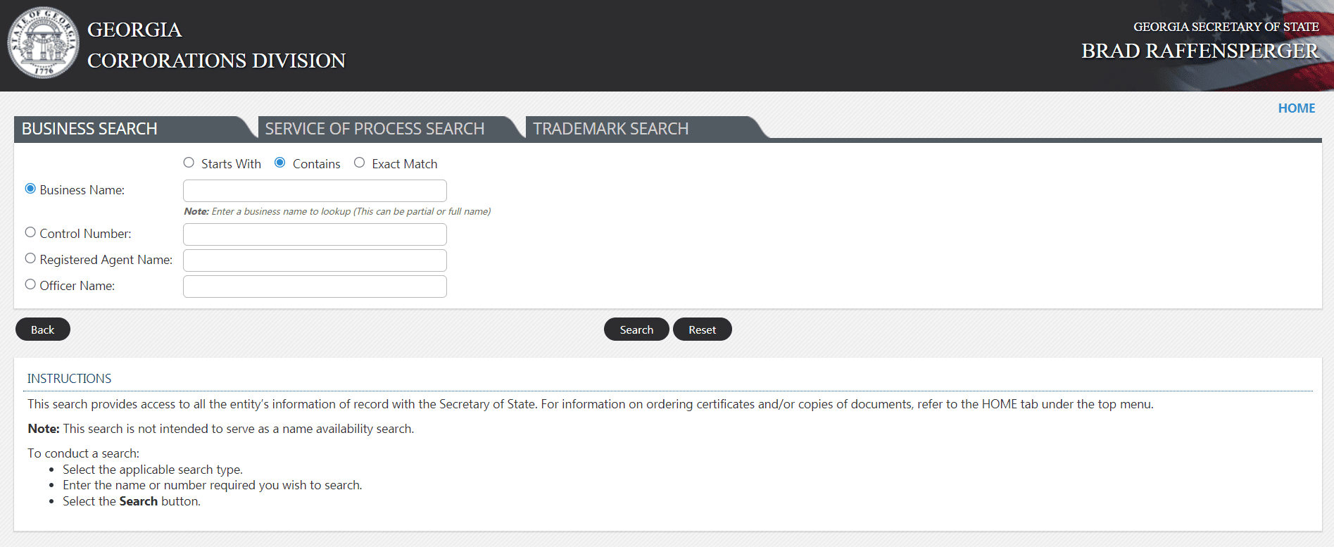 Your first step is to visit the Georgia Corporations Division’s business search page, which brings you to the page below: