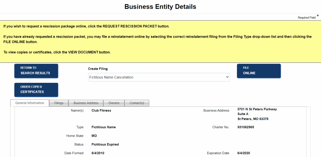 - Name type (Club Fitness is a fictitious/DBA name filing)