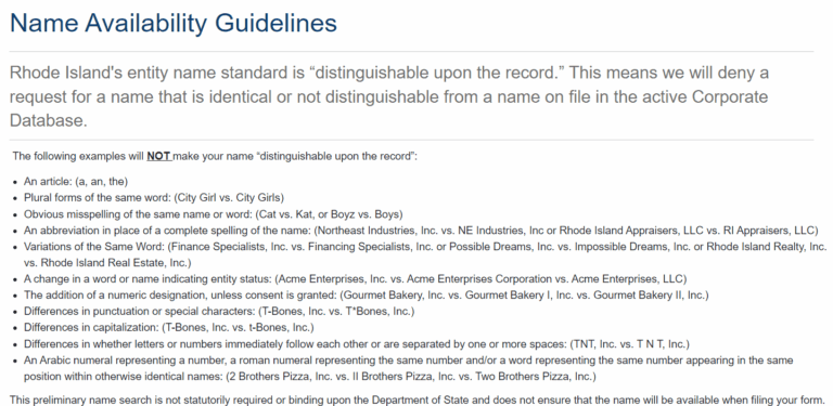 The RI Department of State lists a wide range of unacceptable variations. It’s also essential to note that a preliminary business entity search is not required under Rhode Island statutes. However, filing an LLC in Rhode Island that fails to pass muster could result in a significant financial setback.