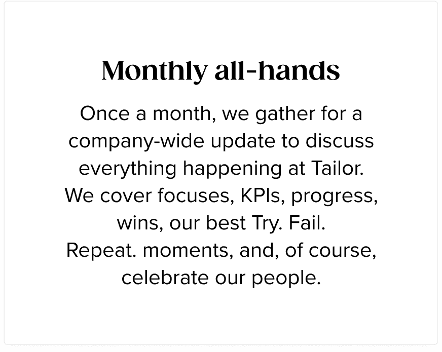 At Tailor, we believe alignment is the golden key to team success. That’s why we’re committed to investing time and resources in ongoing processes to ensure everyone stays on the same page.