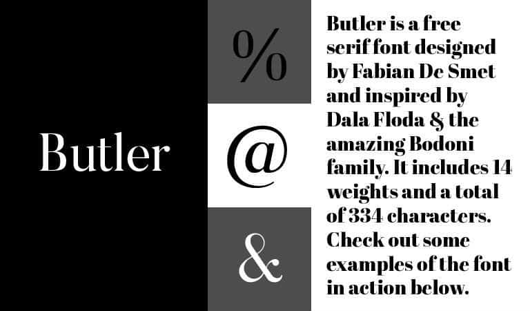 Like you can see above, this serif draws inspiration from the Bodoni typefaces (see font #1 on our list). The high contrast lends itself to numerous projects, from large headers on posters and the like to smaller body text.