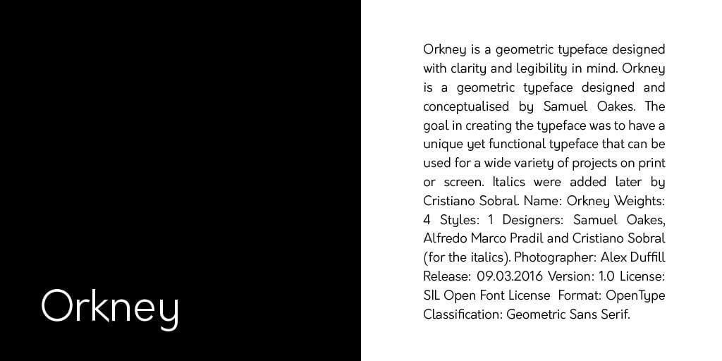 Available in 4 weights and one style, Orkney is the perfect font for both print and screen – ranging from business websites to printed marketing materials.