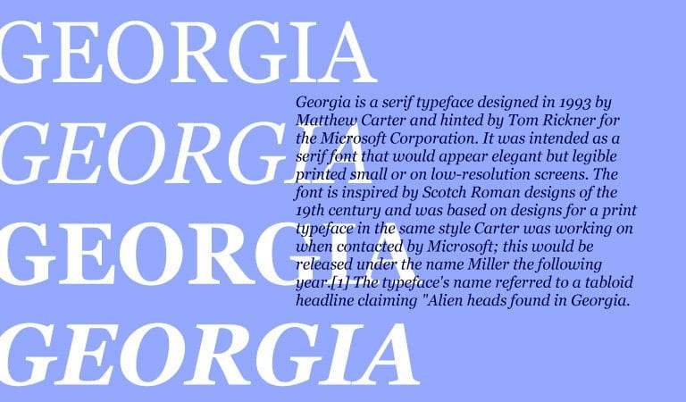 The stylish Georgia font is a combination of beauty and simplicity. Unlike its older predecessors, this type was created for the technological generation and designed to ensure readability at low screen resolution. It comes in four main varieties: Regular, bold, italic, and bold italic.