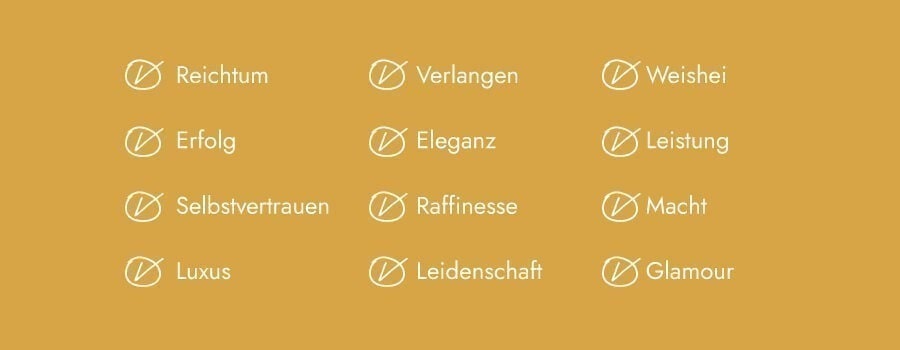 Wie bereits erwähnt, steht Gold für Attribute wie Wohlstand, Erfolg, Vertrauen, Luxus, Leidenschaft, Leistung und Macht. Es gibt bestimmte Formen, die gut zu Gold passen.