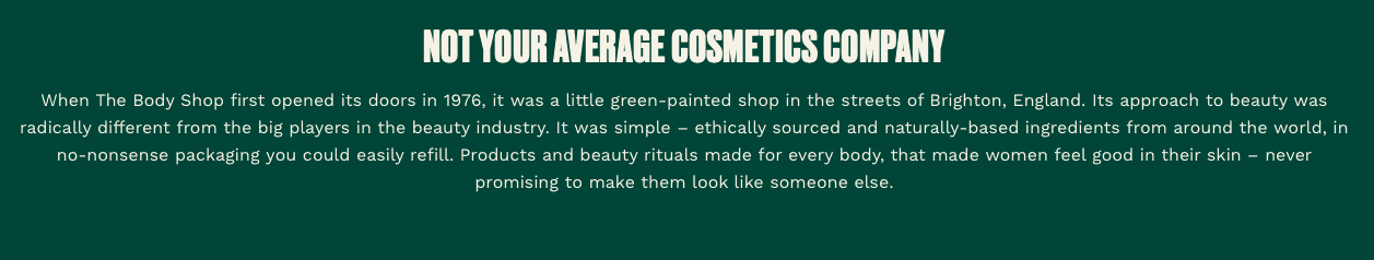 ● Brand mission represents an organization’s goals. For The Body Shop, it is to provide “ethically sourced and naturally-based ingredients from around the world, in no-nonsense packaging [consumers] could easily refill.”