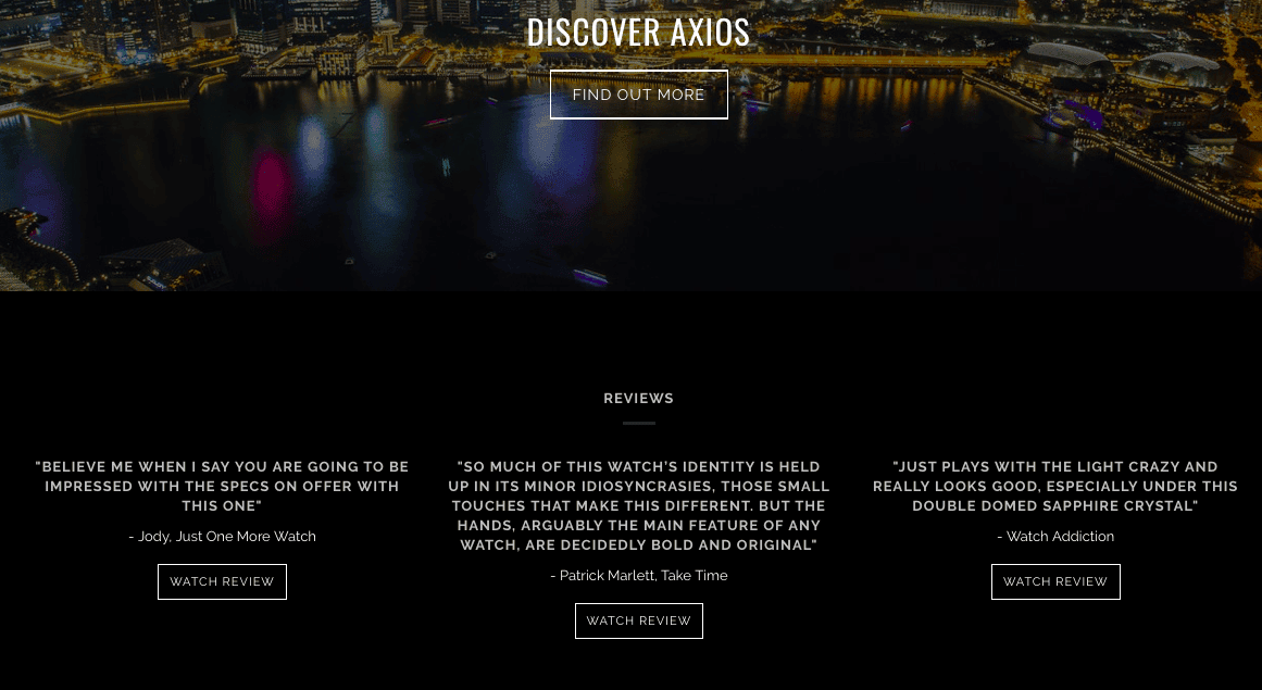You can display social proof on your homepage and social media profiles. Do this by integrating Trustpilot and Google ratings, sharing reviews from your satisfied customers, and displaying user-generated images. For a great example, take a look at how Axios Watches did it.