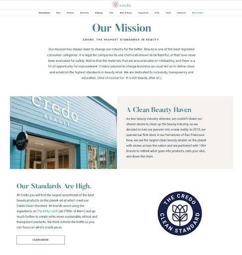 What can I say? They nailed it. This brand is all about keeping things simple and natural—and it shows on their page. Credo used the power of their brand story and values to invite visitors to join them on their journey. They also highlight that 90% of women lead their team—an important fact for their customers to know.