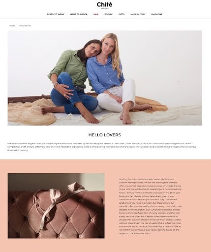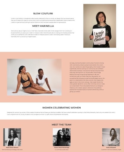 If you need a visual for a classic About page layout, take a look at Chitè Lingerie. They did everything by the book yet added their unique story. Right away, they tell you their mission and what makes them different from their competitors. This is followed by an introduction of the founder, their achievements, and staff bios. And it’s all tied in with an elegant design that matches their brand identity.