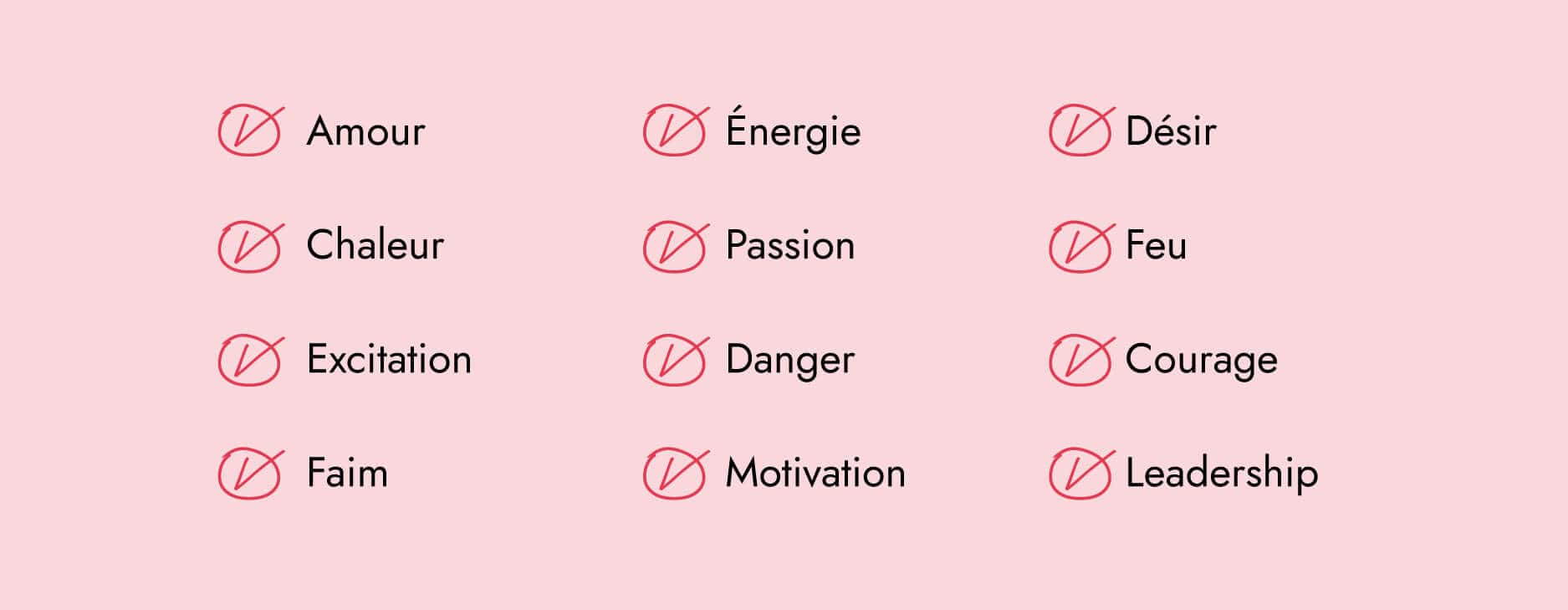 Dans le cas du rouge, vous obtenez un logo qui exprimera l’amour, la chaleur, l’excitation, l’énergie, le courage, le leadership, et plus encore. Consultez la liste complète :