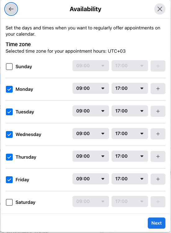 3. A screen will pop up where you will select your hours of availability (as seen below).