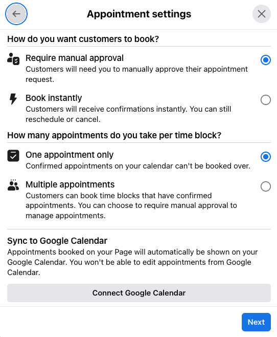 4. You will answer a few simple questions about how you want your customers to book and how many appointments you will accept per time block (as seen below). You also have the option to connect to your Google Calendar.