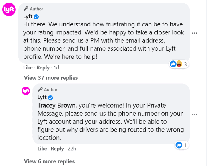 Remember to be pleasant and polite, like Lyft in the Facebook comment below, to show your customers that you have their best interests at heart.