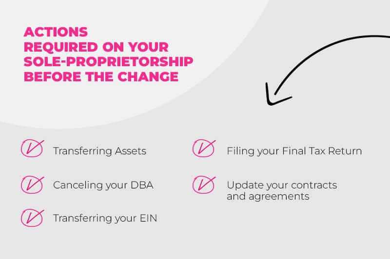To ensure any contracts and agreements you have in place remain valid, you must update them from your sole proprietorship trading name to your new LLC name when you change your business structure.