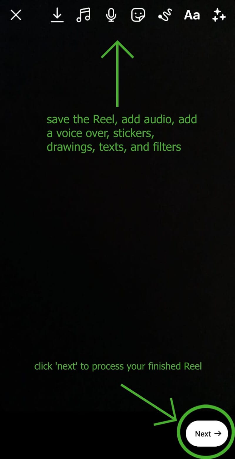 Step 5: When you’re done recording, you can add captions, stickers, and text to your Reel.