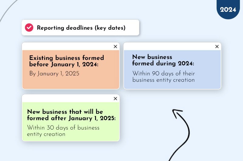 The CTA came into effect As of January 1, 2024 and affects many US-registered businesses, however, the timeframes and reporting dates depend on your business formation date.