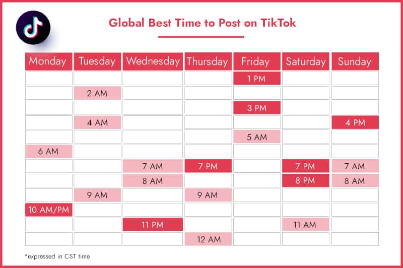 The best time to post on TikTok generally follows a typical work/school schedule. Post in the morning from 6 A.M. to 10 A.M. and at night from 7 P.M. to 11 P.M. On Fridays, you’ll want to get up early as the best time to post is at 5 A.M.