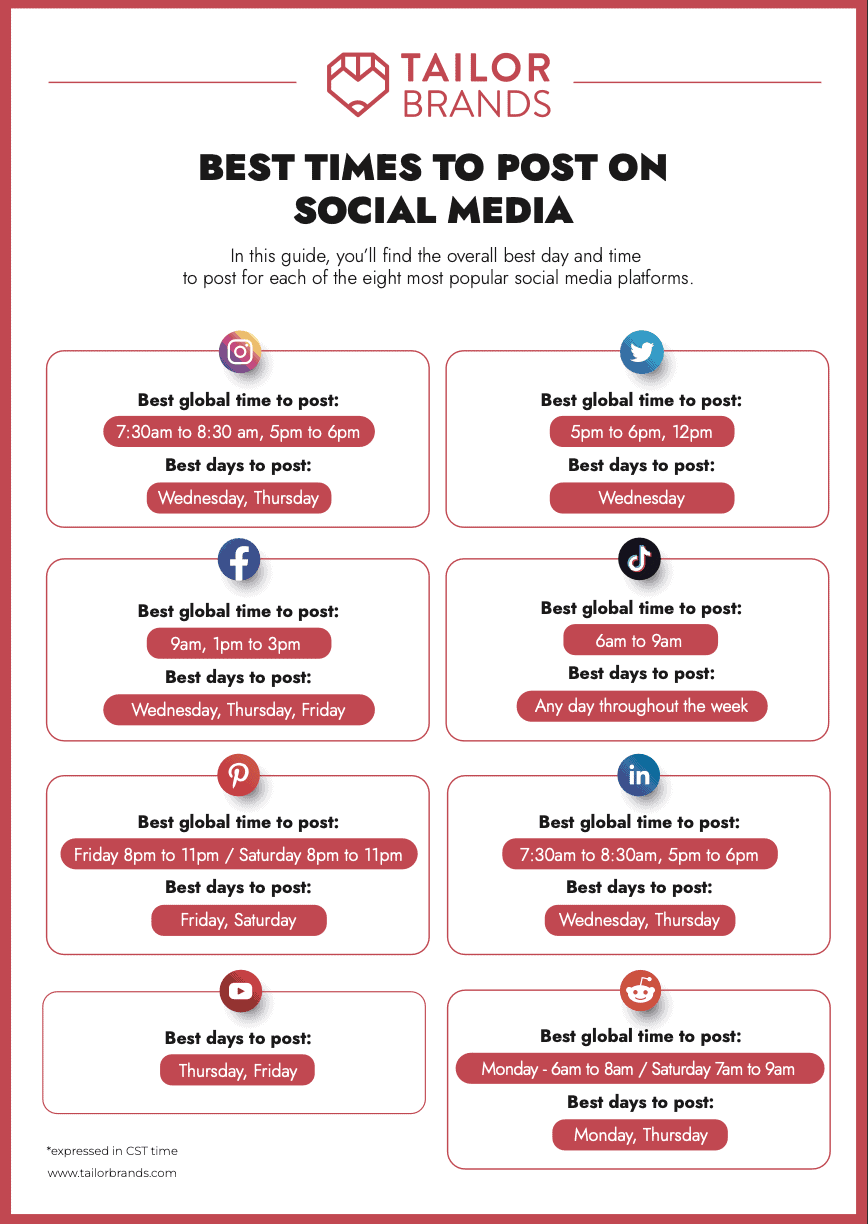 However, there is a general universal time you can use as a starting point until you learn more about your audience. Once you start to gain more insight into your audience, see what works for you and your audience. Remember, there’s no one-size-fits-all approach to social media, so use this guide as a general recommendation.