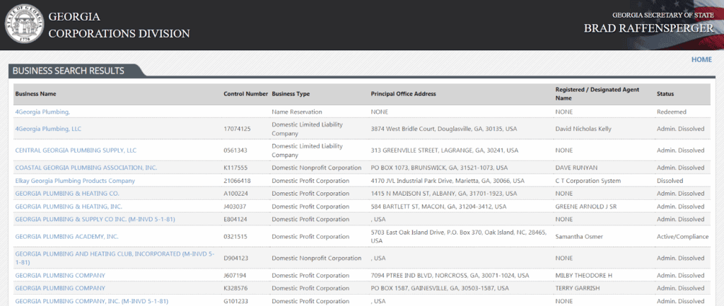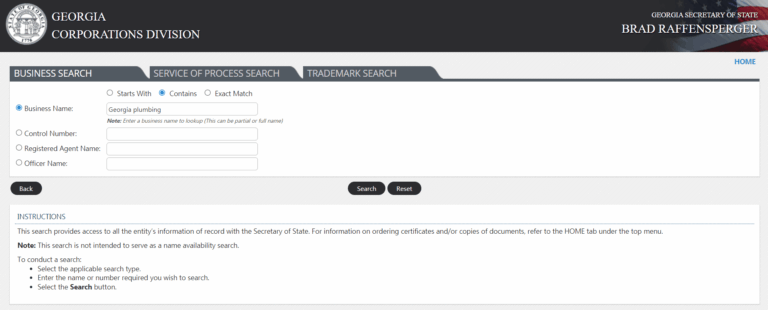 Here, you enter your desired business name, select contains, and press search. I’ll use Georgia plumbing as an example: