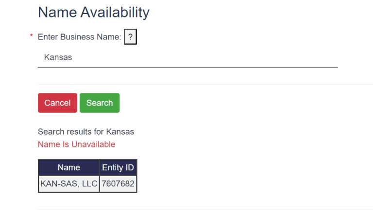 In Kansas you can perform a business entity search, but that’s only partially effective. You’ll also want to perform a full name availability search to make sure you aren’t overlooking anything. This search will tell you whether the name you want to use is available as an option.