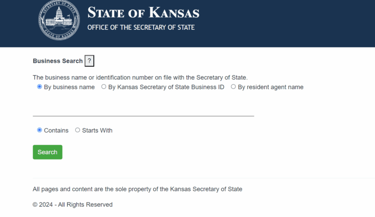 As you can see here, you can search by business name, Kansas Secretary of State Business ID, or resident agent name. You can also choose whether to search by a word or phrase at the start of the name or just a word or phrase contained in that name.