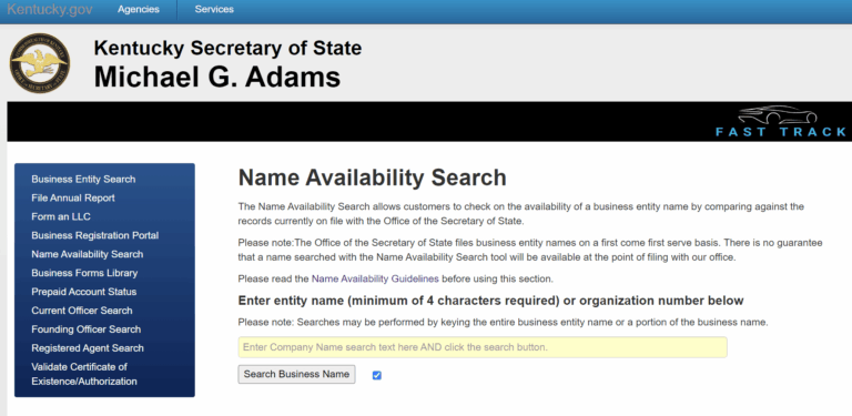 In Kentucky the best way to check if the LLC name you want is available is to perform a name availability search on the Secretary of State’s website.
