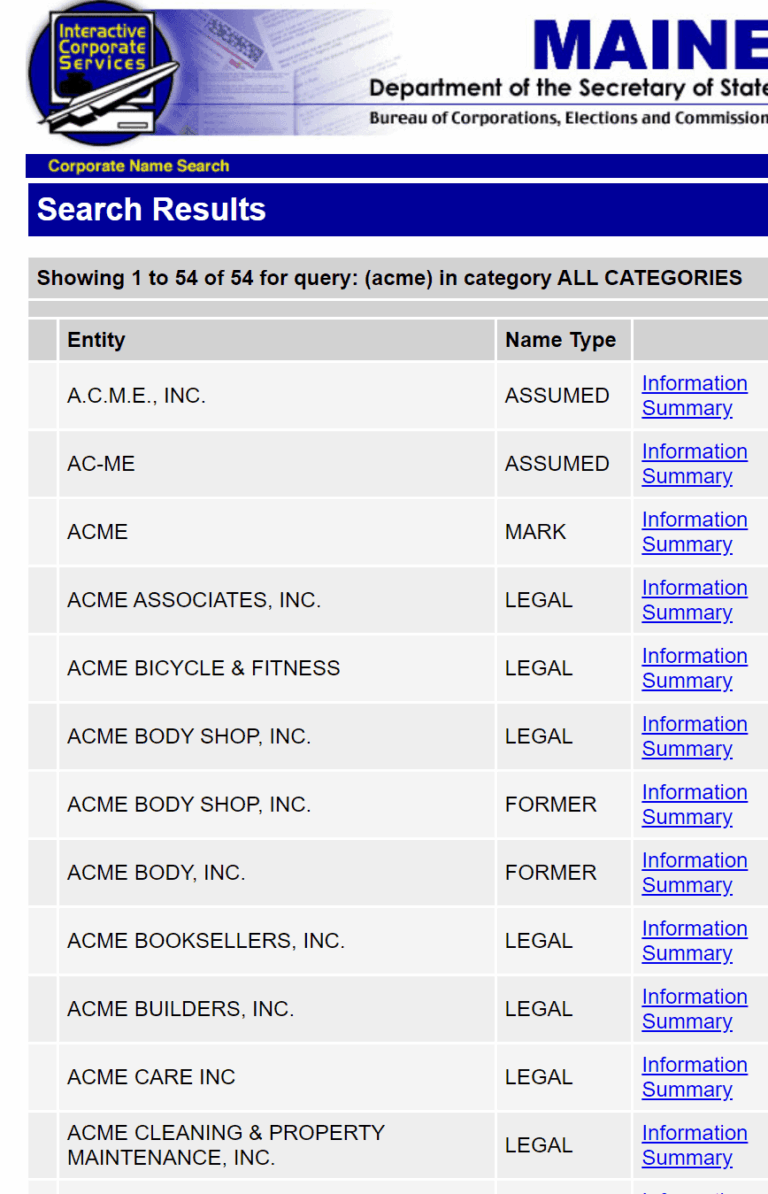 The Name Type column tells you whether the name is a legal name, an assumed (or DBA) name, a name for a company that no longer exists, or a mark. (A mark in Maine includes trademarks and some other designations.) You can click the Information Summary for more details.