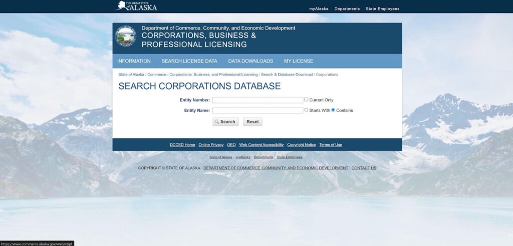 You can search all of the businesses in Alaska by using the Alaska Department of Commerce, Community, and Economic Development’s business name database. This database provides two different search options: