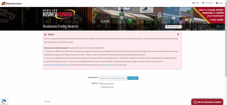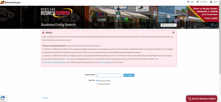 Ready to search for your chosen business name? Follow these steps to look up availability using Maryland’s Secretary of State’s business entity search tool: