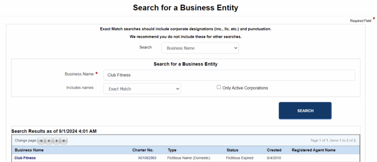 - Name type (Club Fitness is a fictitious/DBA name filing)