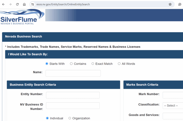 Use the Nevada Secretary of State’s Business Search to check whether your name is available.
