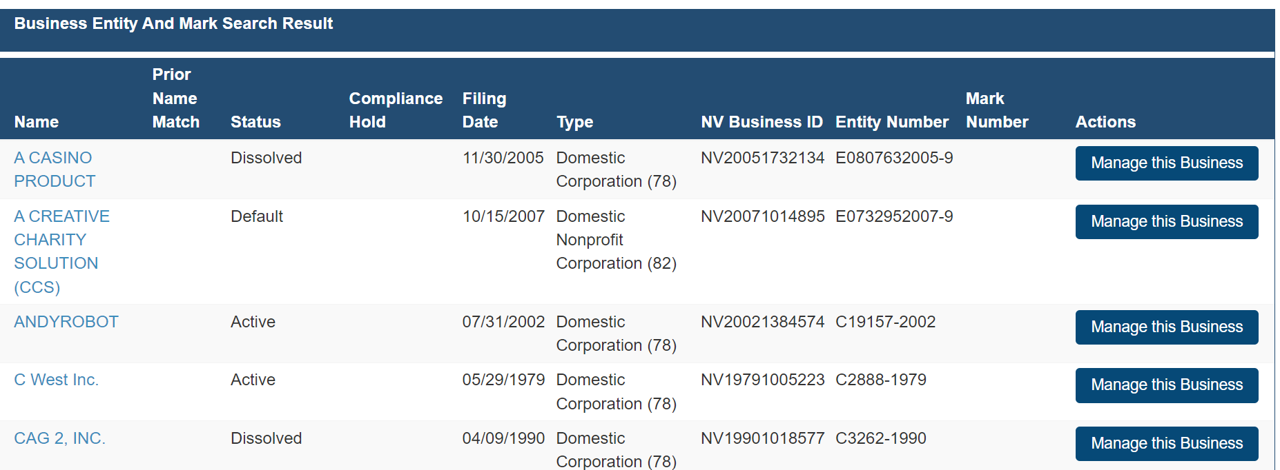 To start your search, visit the Nevada Secretary of State’s Business Search.