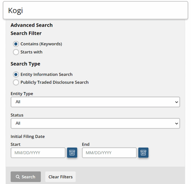 The advanced search function digs deeper and enables you to search for non-active entities and narrow the results by business type, filing date, status, etc.