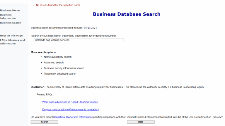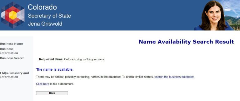 - If your name is available (per my example), follow the instructions and search the business database to confirm it isn’t overly similar to any names on file with the Colorado Secretary of State.