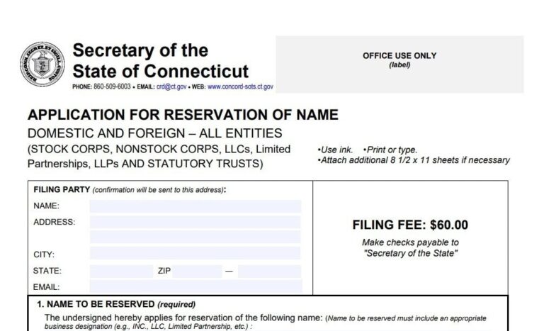 Connecticut charges a $60 fee when filing an Application for Reservation of Name form. You can reserve a business name for up to 120 days, and the reservation can be renewed at an additional cost.