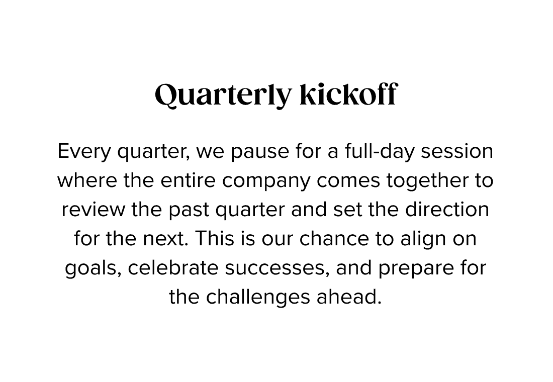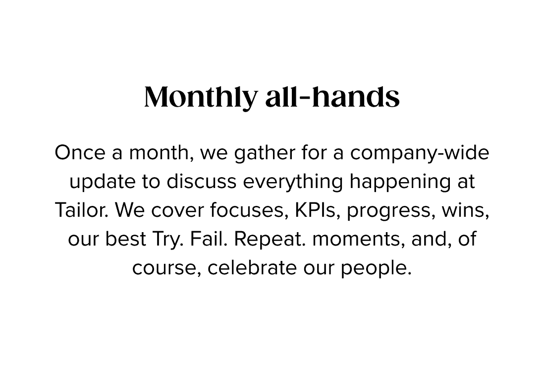 At Tailor, we believe alignment is the golden key to team success. That’s why we’re committed to investing time and resources in ongoing processes to ensure everyone stays on the same page.