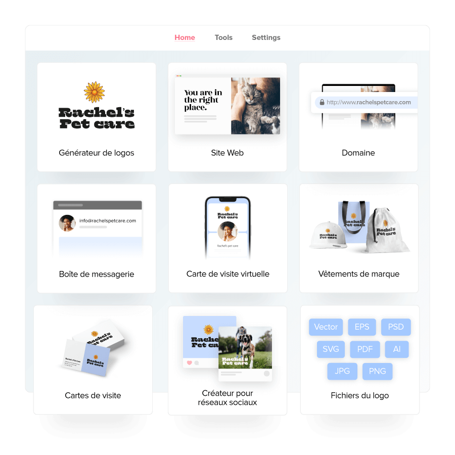 Utilisez notre outil d’IA pour créer un logo et un guide de style. Vous aurez accès à des designs pour les réseaux sociaux qui incluront votre logo et votre thème.