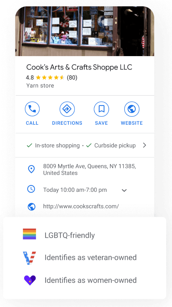 For example, the image above shows that Cook’s Art & Crafts Shoppe LLC is veteran and women-owned. By adding unique qualities to your profile, you can connect with your audience and look more professional online.