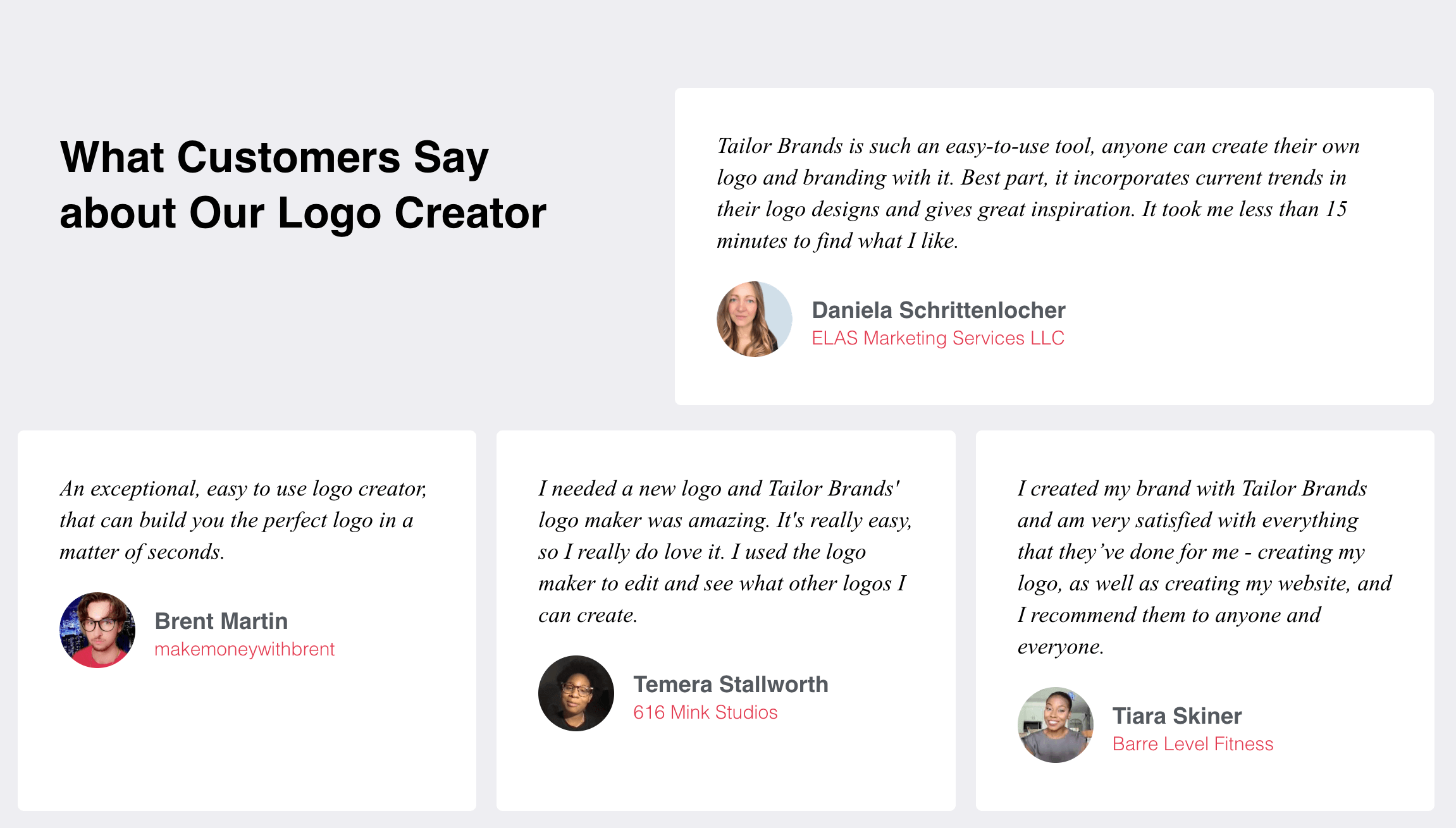 As you can see above, each testimonial talks about their experience with Tailor Brands, both with our logo maker and overall customer service experience.