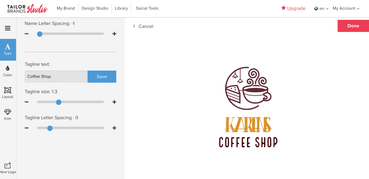 No seu editor de logotipo, se você quiser ajustar o kerning do logotipo, basta clicar em “Tipo”.