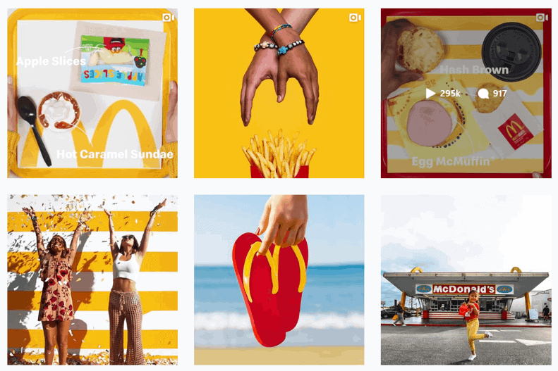 McDonalds’ Instagram page depicts vibrant images of food and happy customers, but where it really shines is in the consistency of its color palette. The company finds creative ways to use its classic red and yellow color.