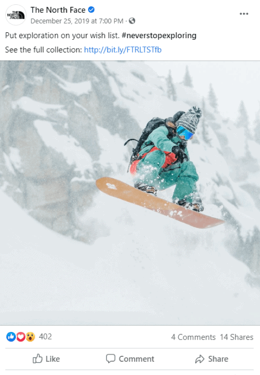 On its Facebook page, outdoor clothing company The North Face uses a combination of brand language and tone to sound rugged, adventurous, and inspirational.