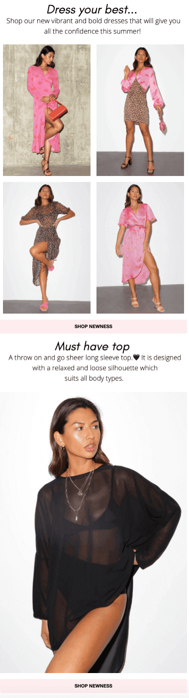 Never Fully Dressed’s newsletter uses the power of images to showcase its products and has two CTA’s on its newsletter.