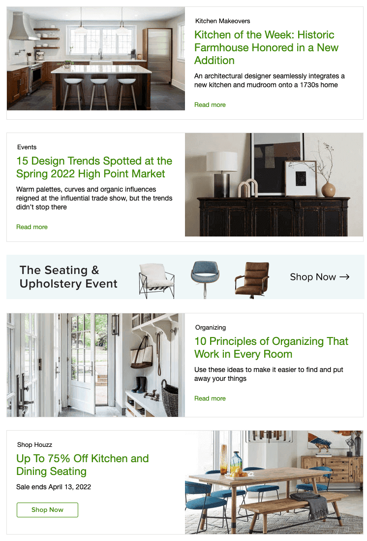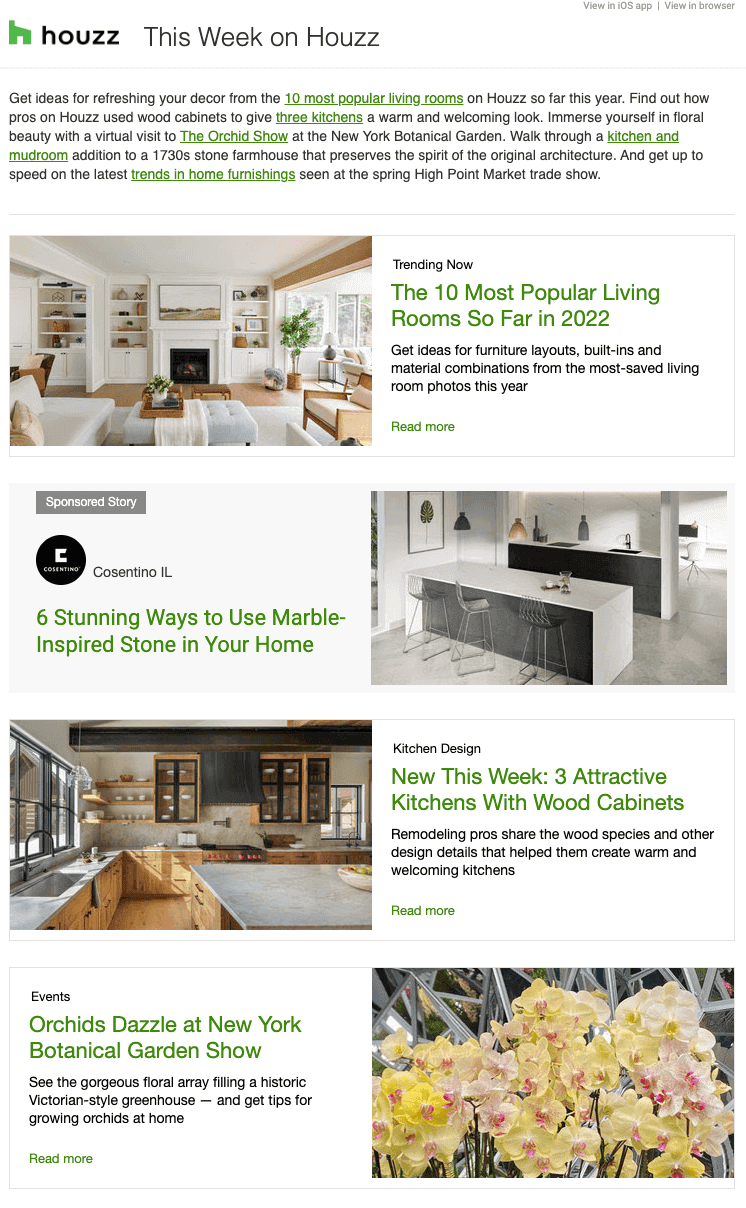 Houzz offers products and services for people looking to renovate their homes; however, you don’t know that until mid-way down the newsletter. Yes, they do have two CTA’s, but the main purpose is to provide helpful renovation tips and designs to readers. As you see, the rest of the newsletter provides valuable content to its audience.