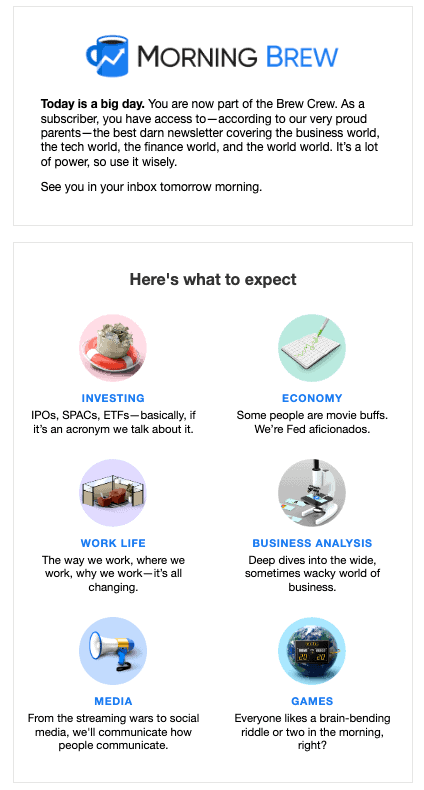 The Morning Brew’s newsletters perfect the art of simplicity. You’ve noticed I’ve mentioned keeping your newsletters clean and simple. When there’s too much on the screen, people don’t like it.
