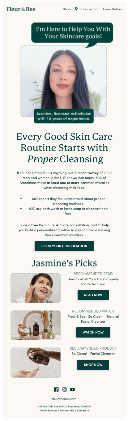 Their newsletter offers free consultations to help their customers achieve a proper skincare routine using their products.